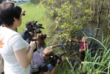 Мы побывали на том самом болоте, где сегодня хорошо чувствуют себя только лягушки. В нескольких местах воду уже спустили, задействовав колодцы. Правда, канавы от леса до колодцев пришлось «пробивать» экскаватором. Несмотря на то, что на прилегающем участке леса вода ушла, по канаве до колодца она продолжает бежать мощным потоком, видно скопившись под землей.